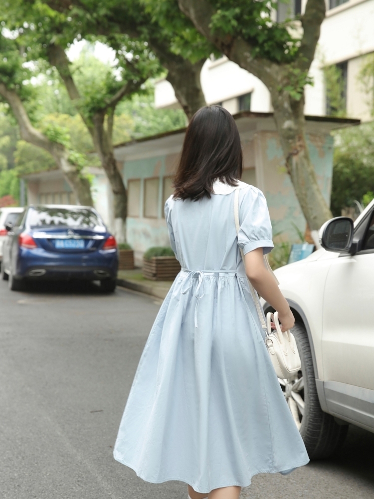 这是一款甜美可爱的连衣裙,采用了撞色衣领的设计,不仅显得可爱清新,还彰显了女性优雅的一面。有一种飘逸的动感裙摆,行动间十分灵动。