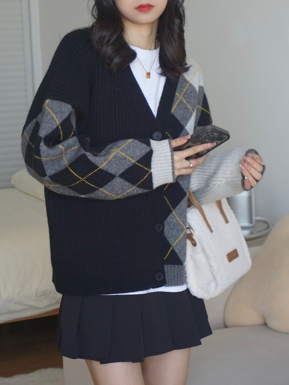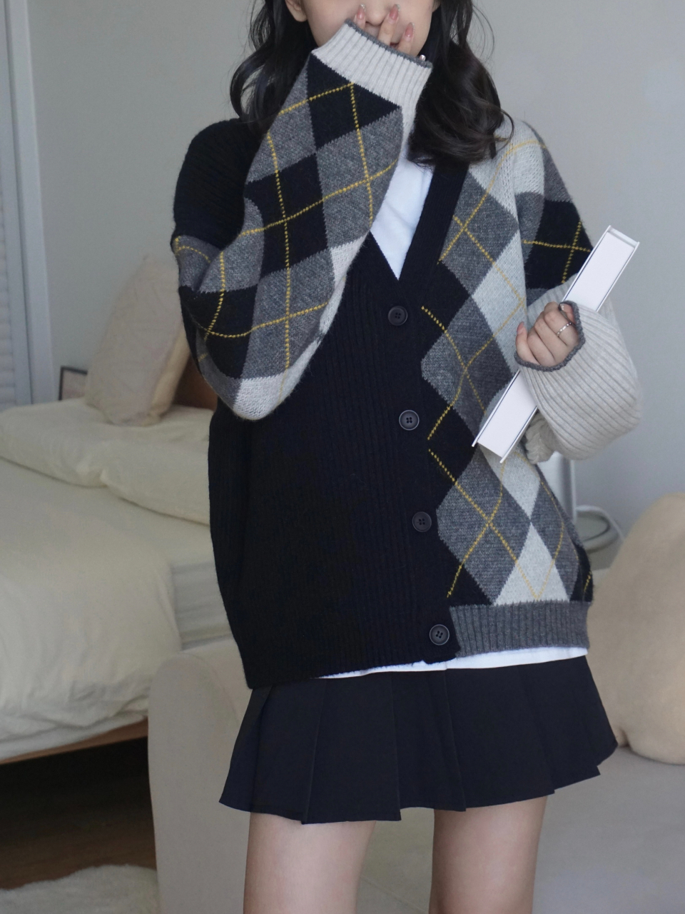 撞色的菱格纹是这款开衫最大的亮点,上身穿着复古又很有文艺范儿,而宽松的版型,可随意凹造型,尽显慵懒气息。