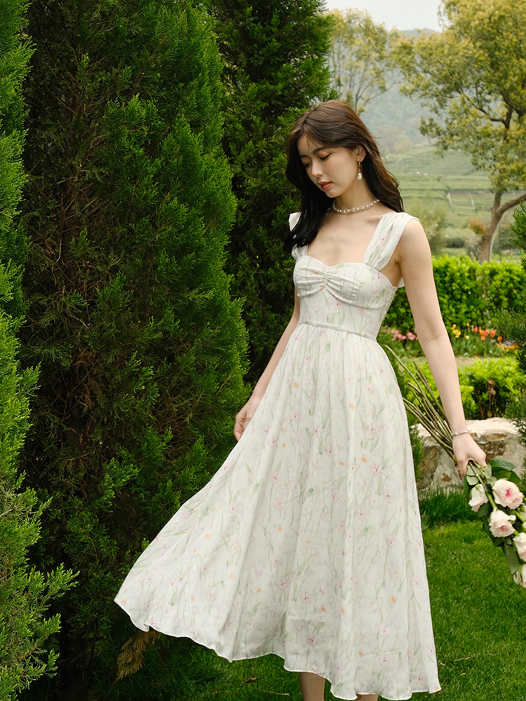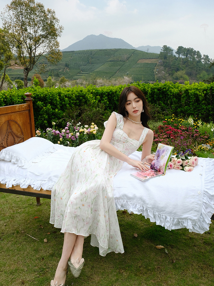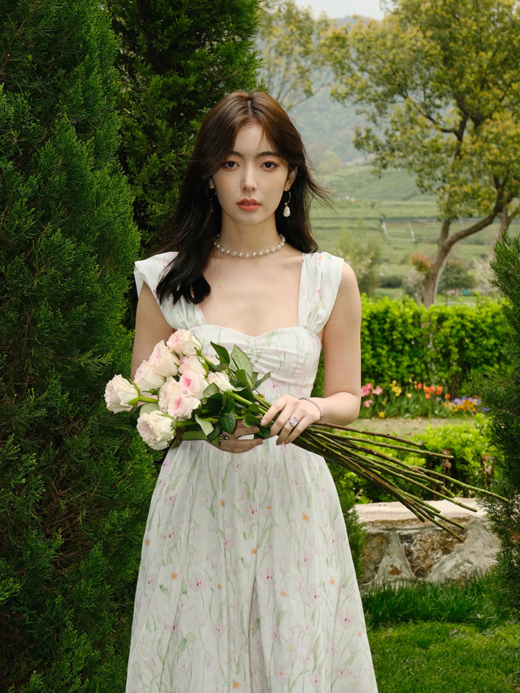 风格采用了无袖的设计,很好的修饰了手臂的线条,裙身的印花图案,很有少女的甜美感,......
