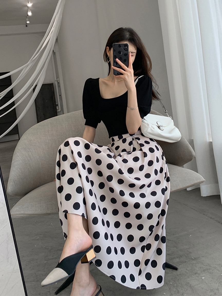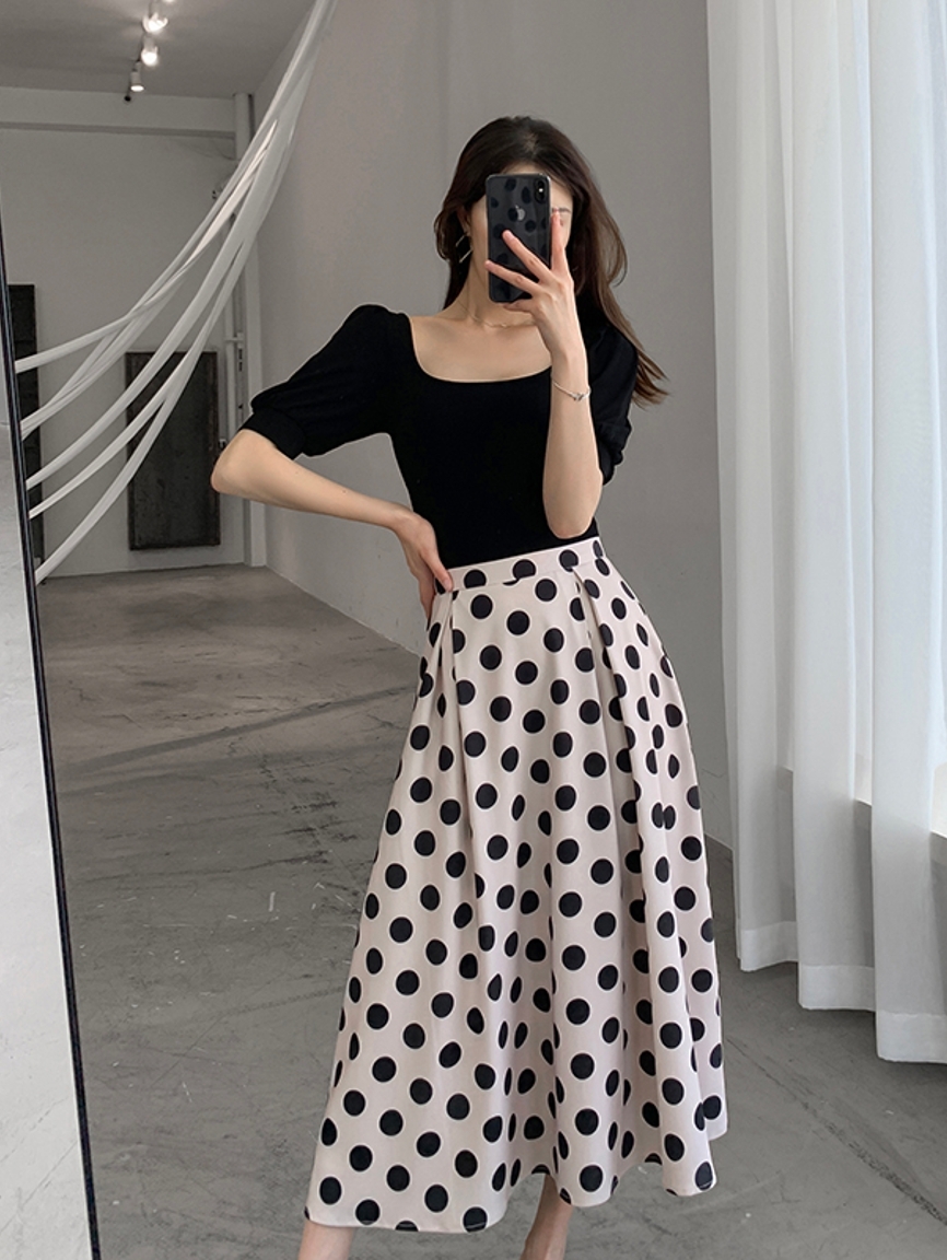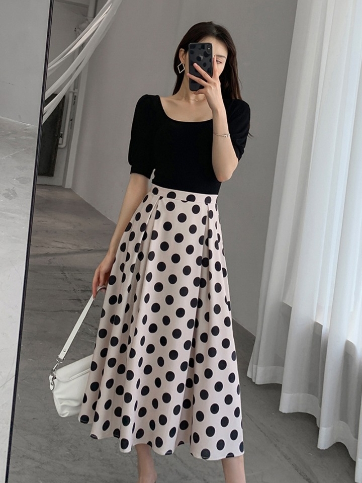 一款套装轻松解决了女性的搭配烦恼,出行更方便;下半身的高腰A字半身裙,遮肉效果好轻松凸显大长腿;波点印花点缀,经典复古久看不厌。