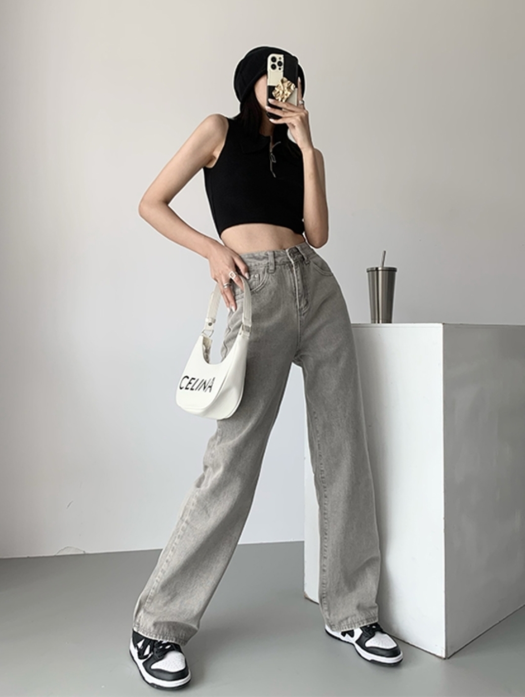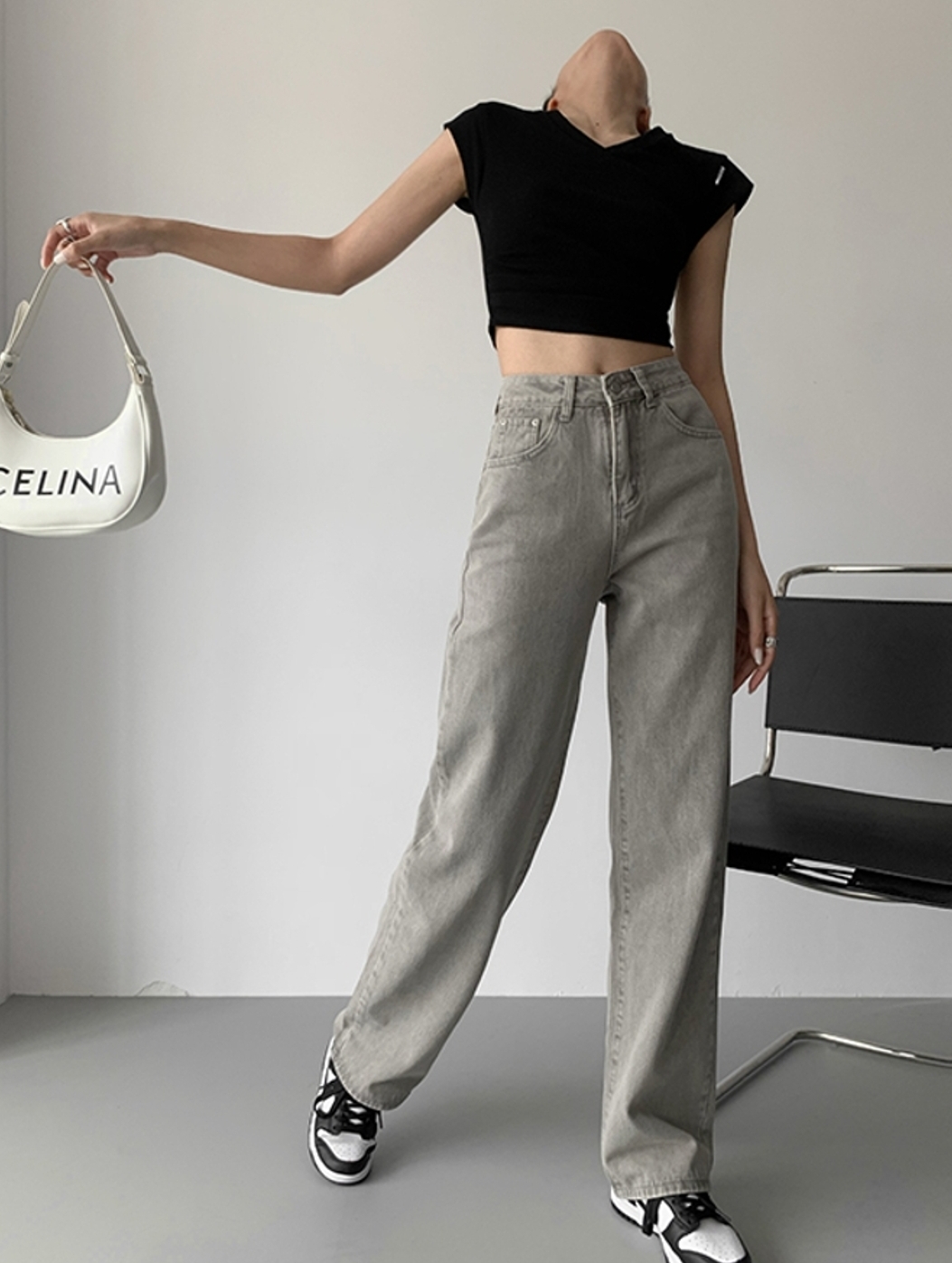 牛仔裤,必备的时尚单品,经久不衰的魅力搭配;高腰设计提升了腰线,高挑显个,直筒廓形可提拉腿部线条,显瘦修腿型。