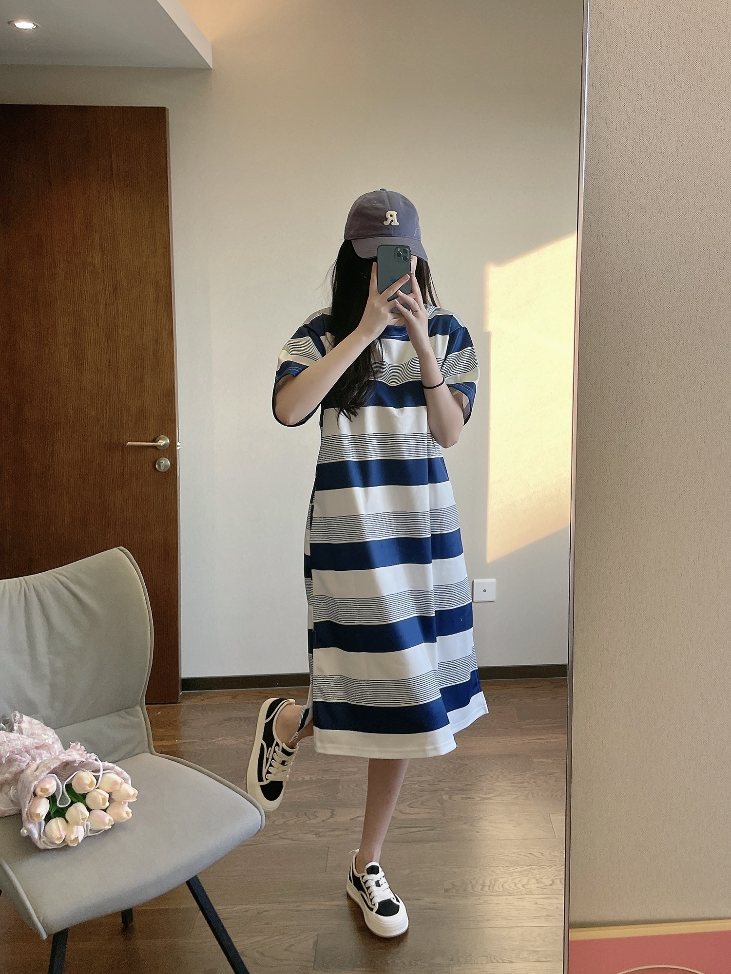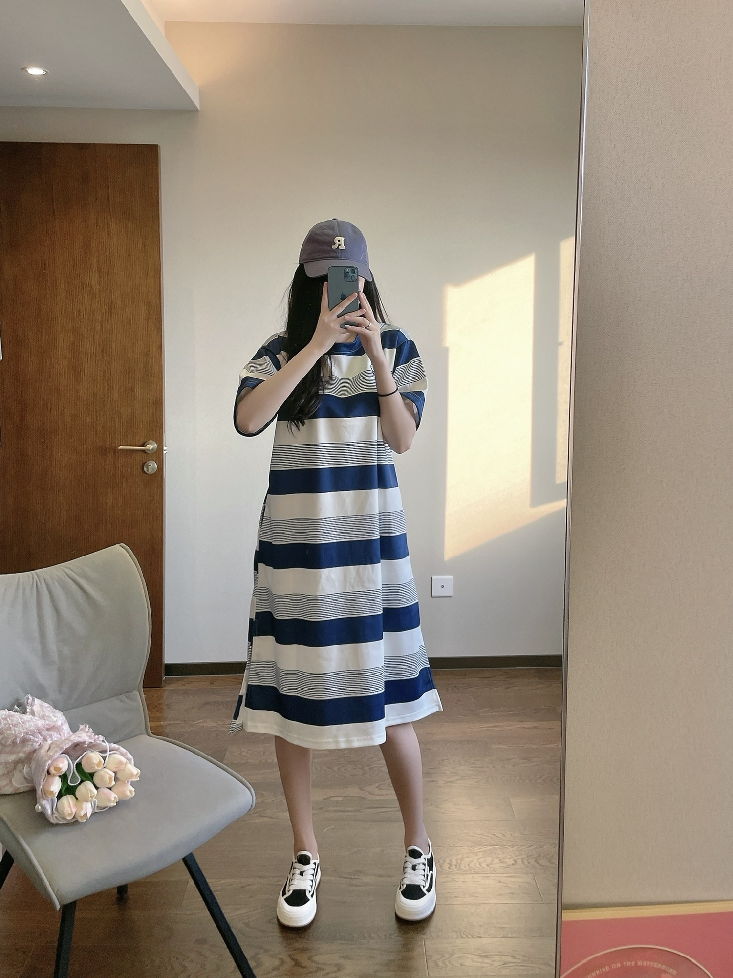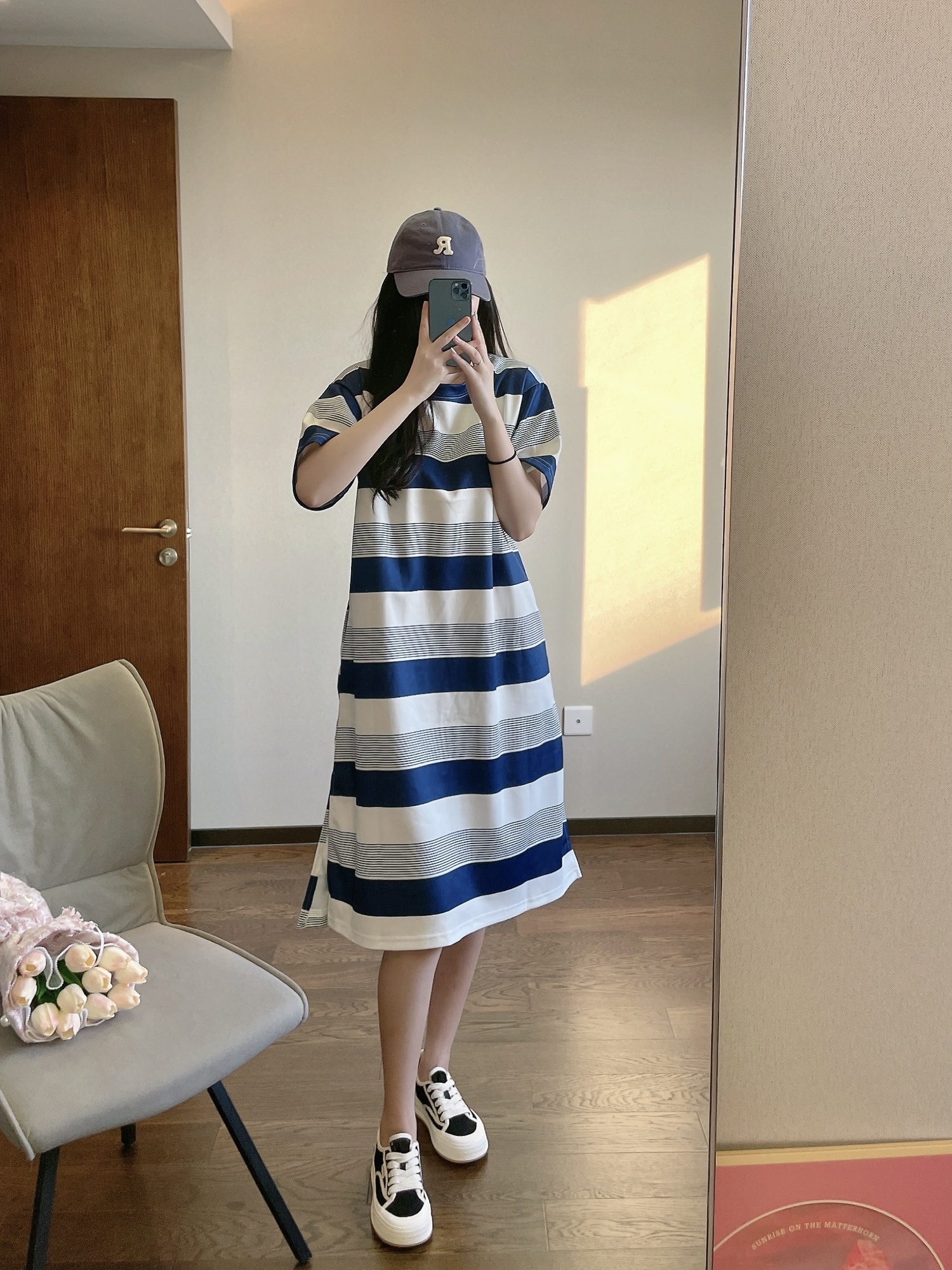 连衣裙穿起来真的很显气质!胸口的刺绣卡通图案特别俏皮可爱,宽条纹的设计视觉上就很显瘦,我真的太爱了。