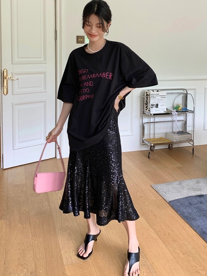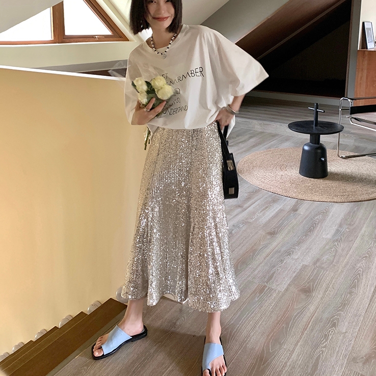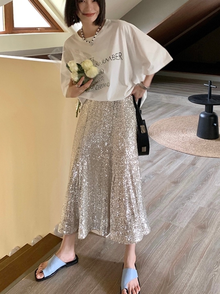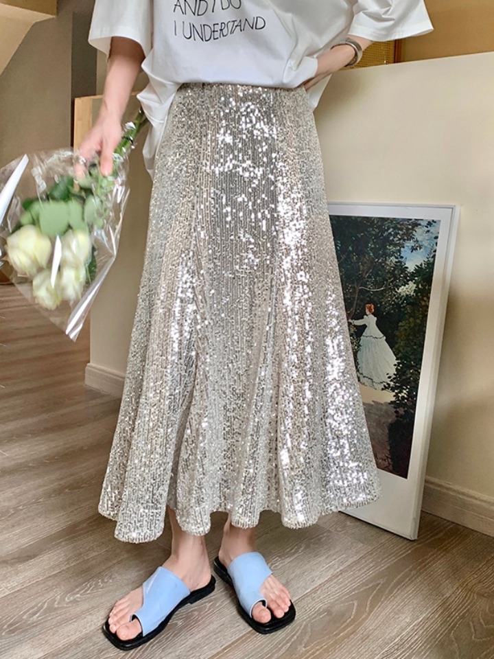 金银色的伞裙,及膝的长度更显优雅气质,高腰的设计,打造下半身的黄金比例,富有肌理感的提花面料,提升整体气质