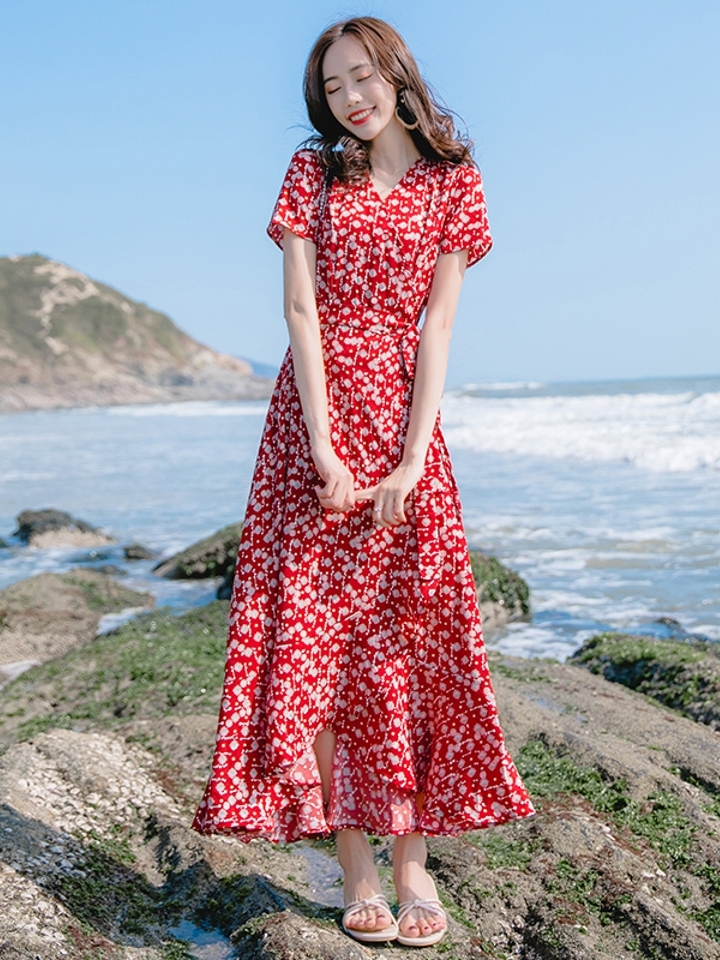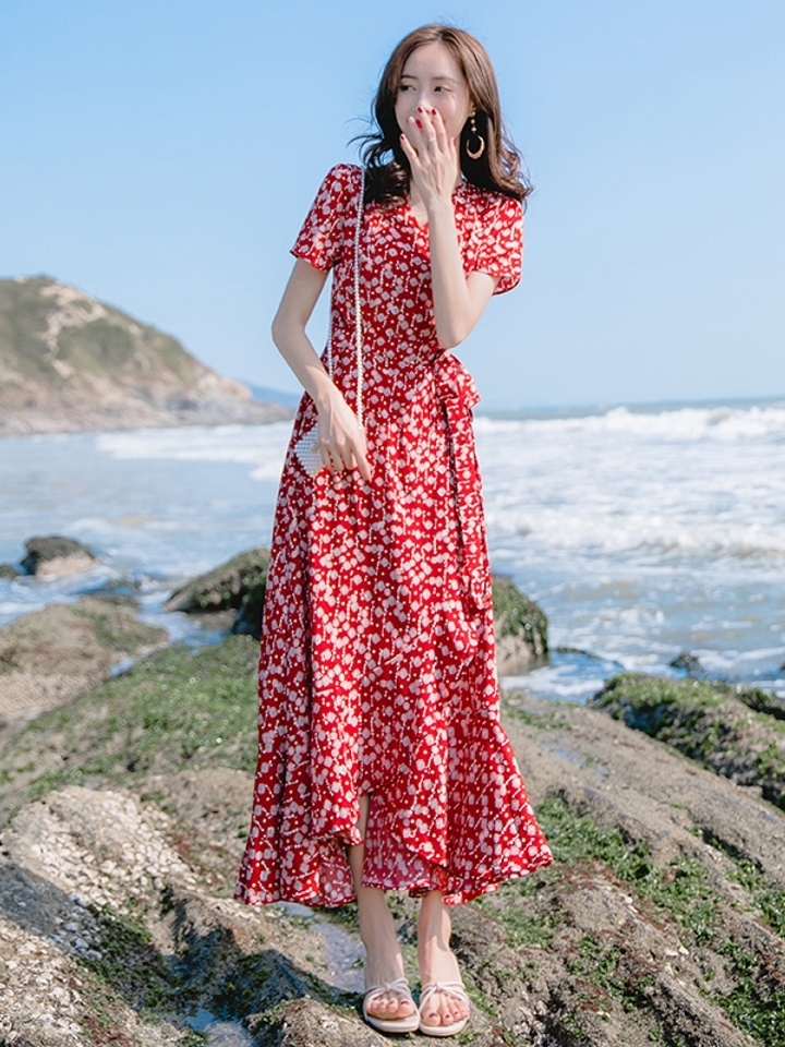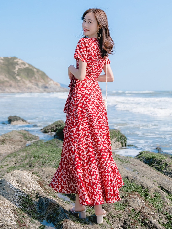一款波西米亚风连衣裙,满身的碎花点缀,充满吸睛特点,轻盈飘逸的雪纺面料,夏日亲近肌肤,非常的清凉舒适,海边度假穿搭,柔美女人味十足。
