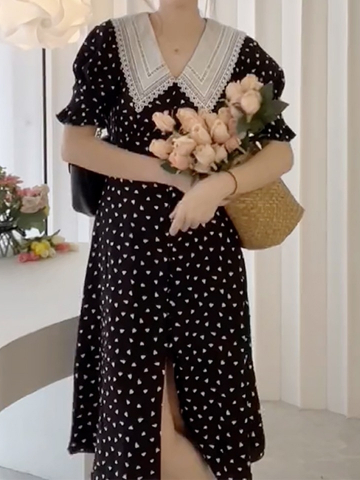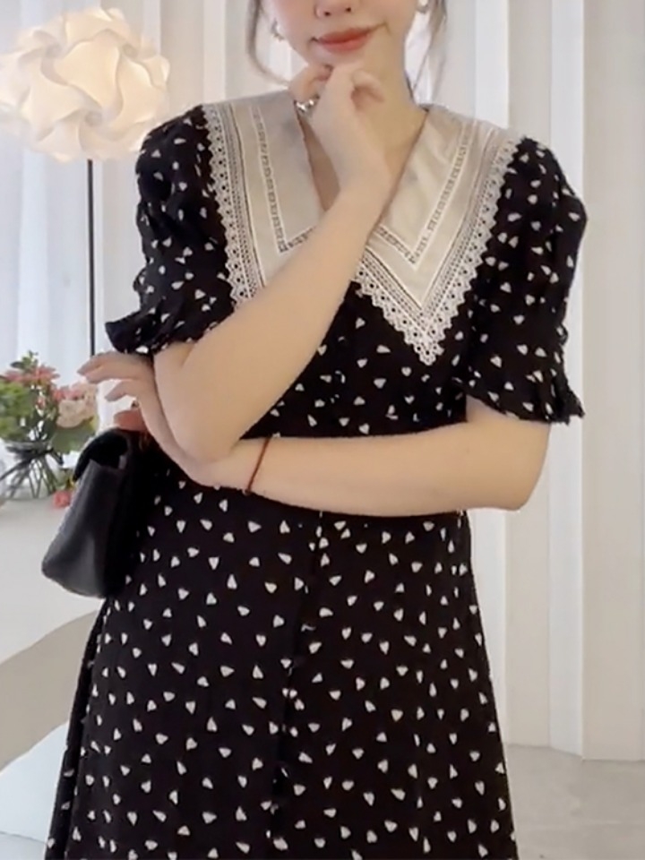 清新感十足的碎花连衣裙,展现满满的少女情怀,底色为藏蓝黑色,接近纯黑,俏皮可爱之余更透着活力的气息,小巧圆润的娃娃领,上身瞬间为你减龄好几岁。
