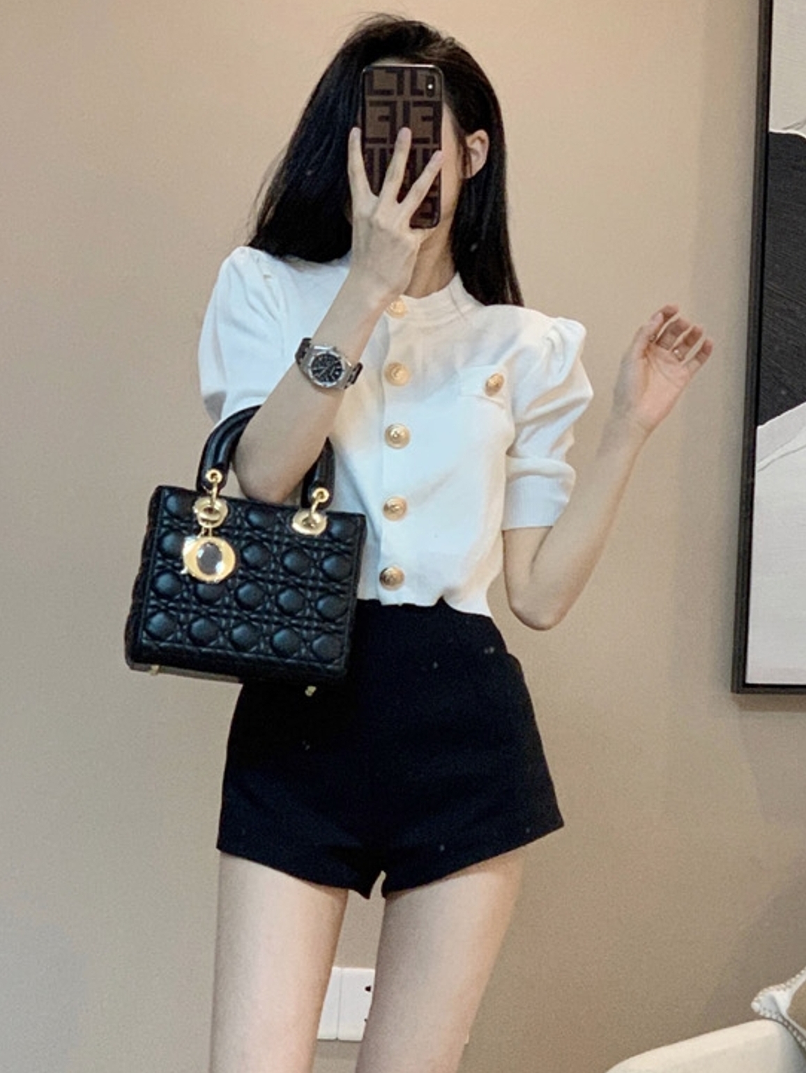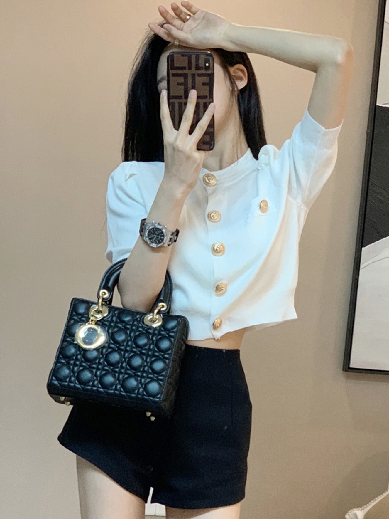 设计亮点短袖针织开衫短款系列,圆领,修身版型,上身简约又显瘦,给衣衣增加了亮点和......