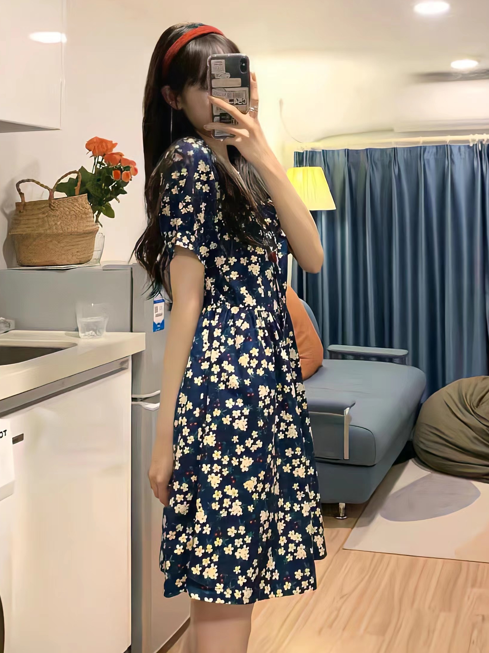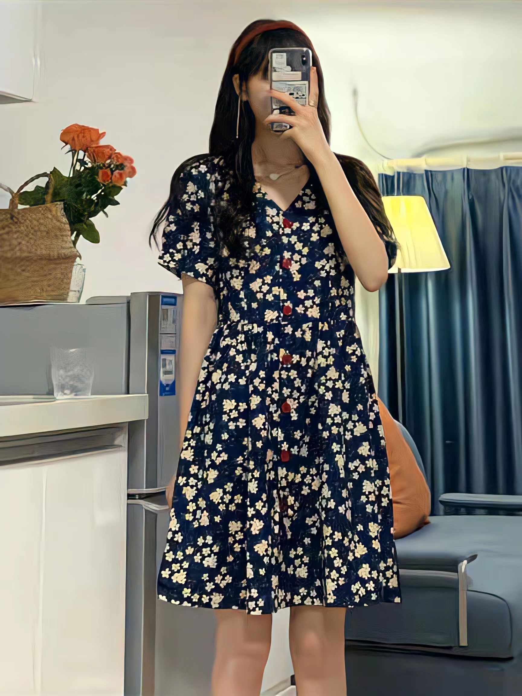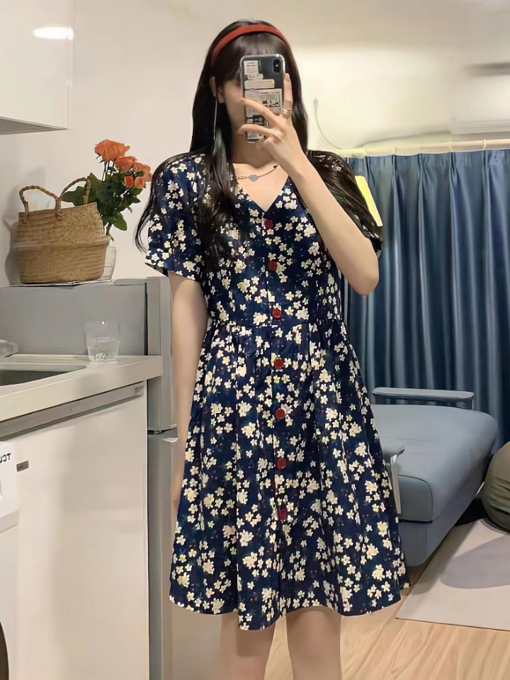 撞色的碎花图案,起到不错的吸睛效果,瞬间让人犹如身处在花海中一样,浪漫极了,V领的设计,凸显迷人的脖颈曲线,自带柔美气质。