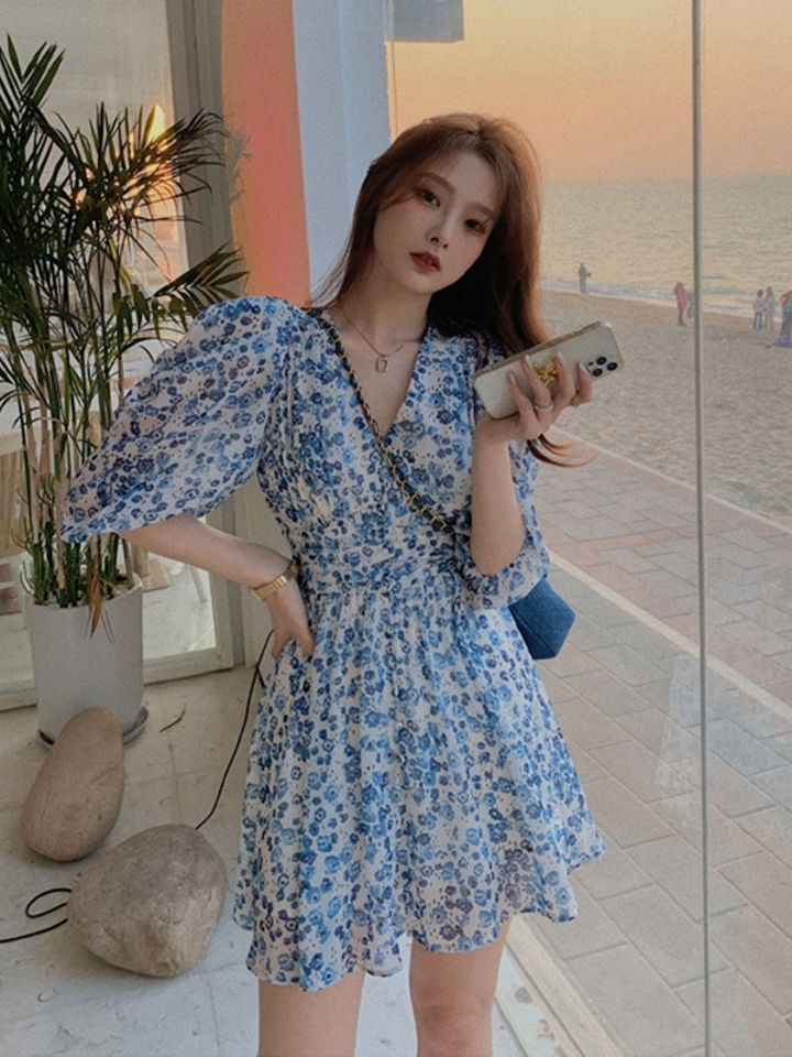 是松紧腰棉混纺料子是了的气场复古带来浓郁的味春天气息的碎花连衣裙+立领设计。