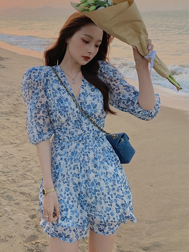 设计亮点袖的长度很显干净利落的气质,碎花收腰真丝连衣裙,修身的版型复古的小碎花图......