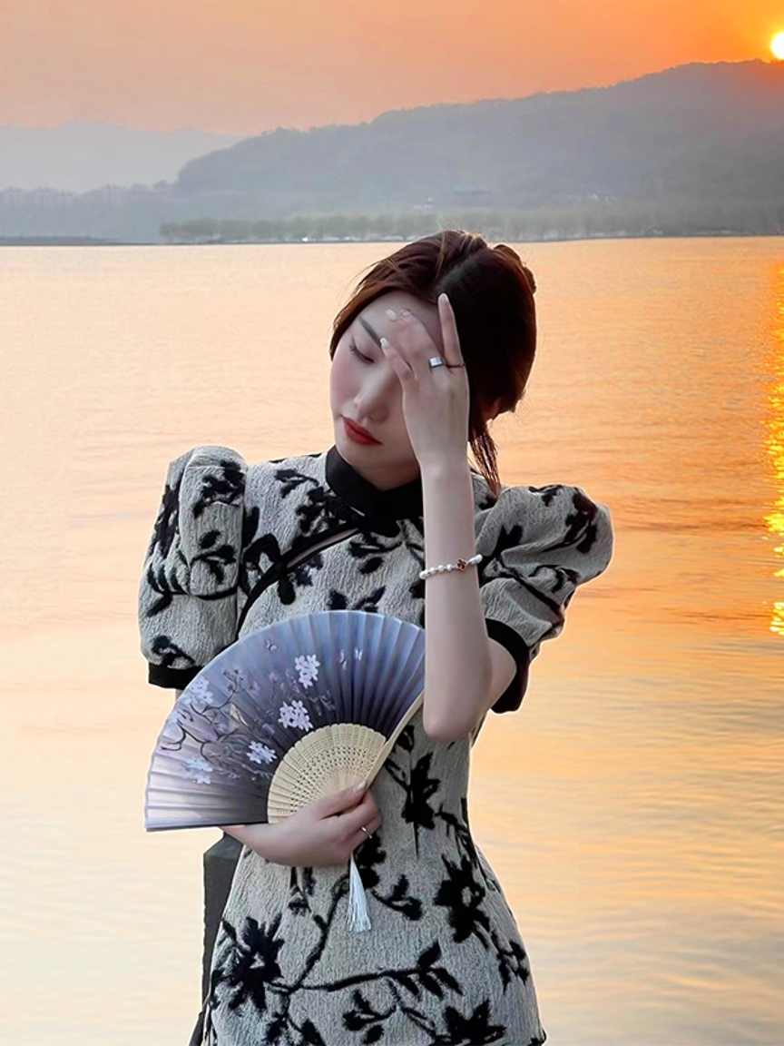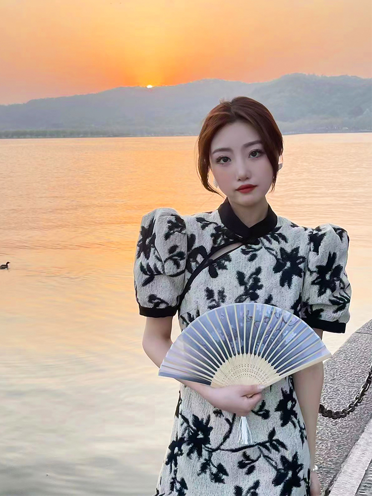 改良版的国风旗袍,精致的手工一字盘扣尽显精美,与小立领的拼接撞色,不失旗袍的韵味与东方女子的独特魅力。