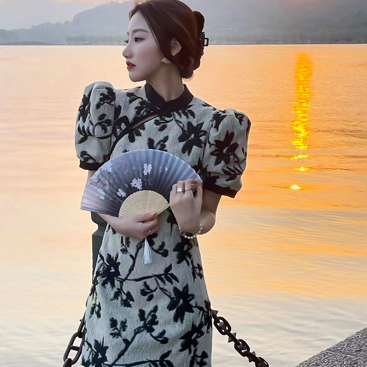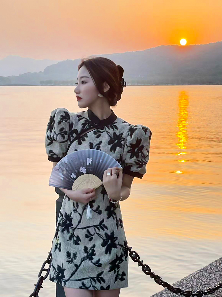 风格改良版的国风旗袍,精致的手工一字盘扣尽显精美,与小立领的拼接撞色,不失旗袍的......