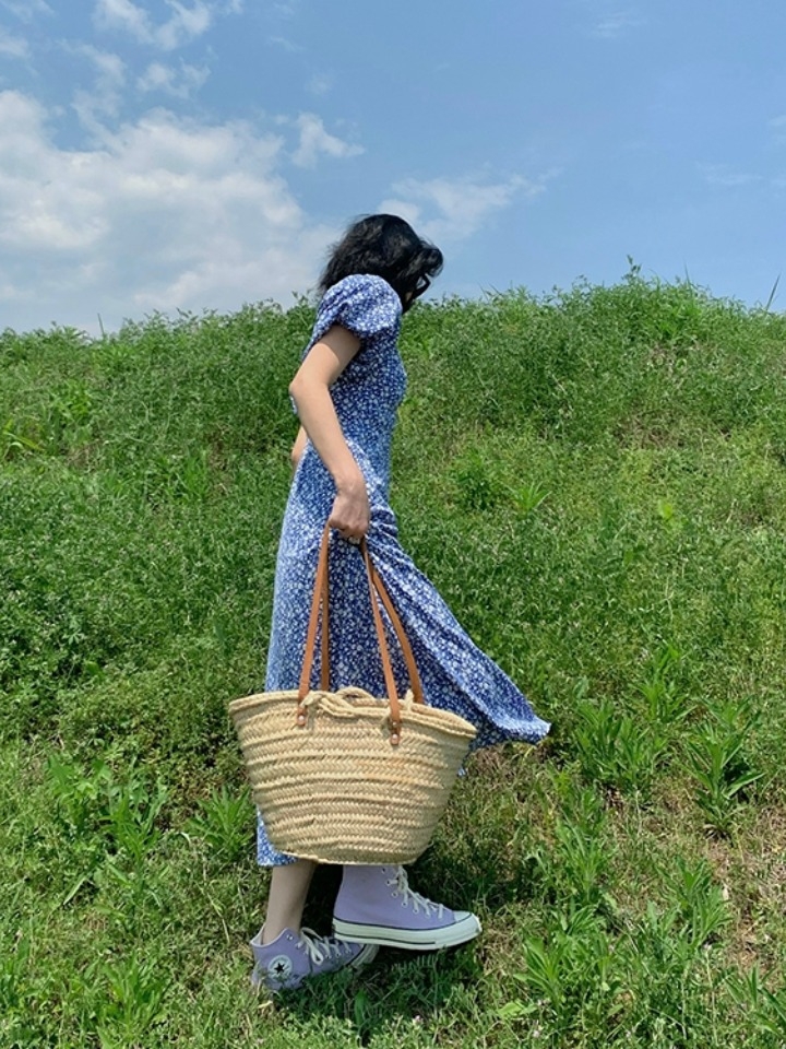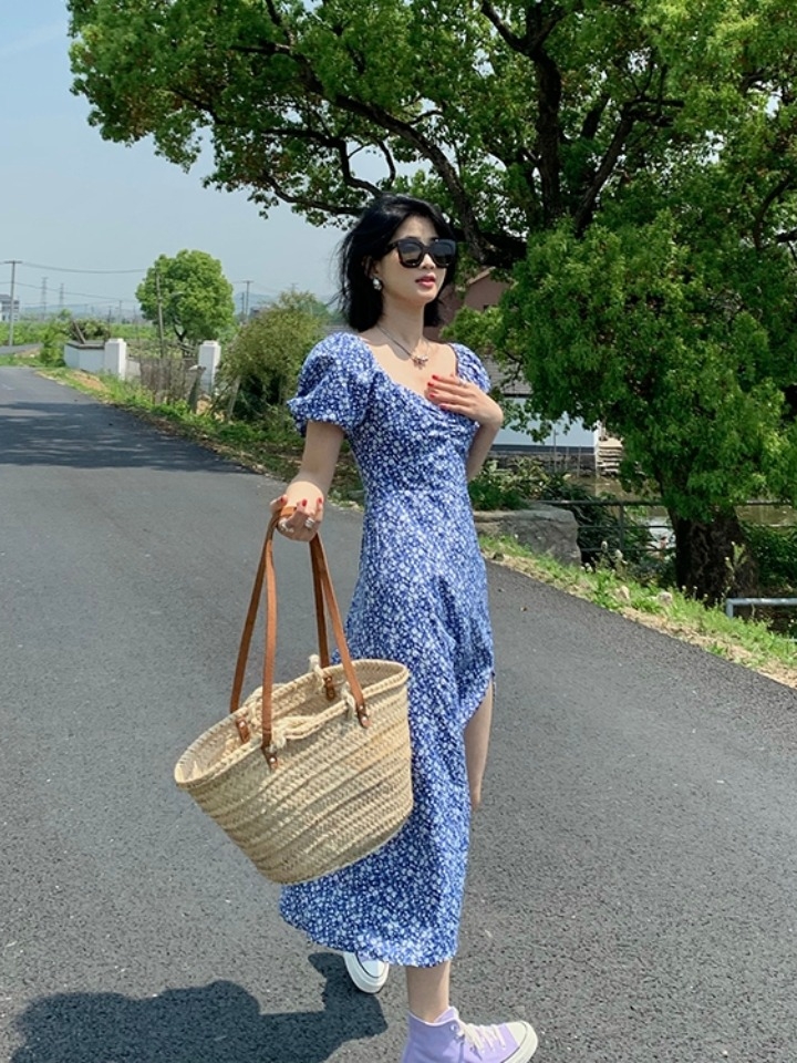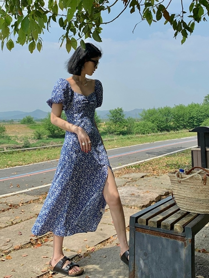 清新的蓝色配上精致的小碎花点缀,甜美减龄。方领设计,秀出迷人的锁骨线条;泡泡衣袖,富有法式的韵味。中长款裙摆配上开叉处理,行走间飘逸随性。